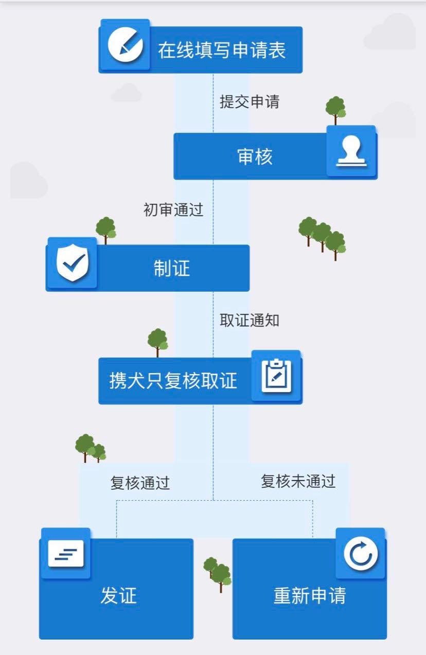 1.养犬人出示身份证由工作人员在养犬管理平台查看是否办理过犬证