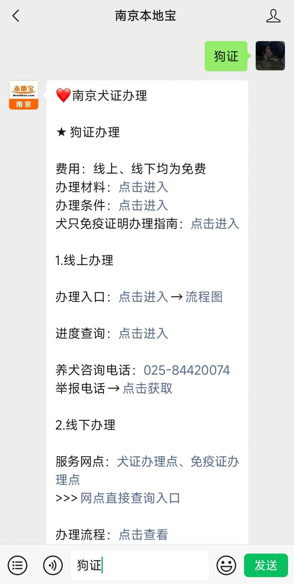 温馨提示:微信搜索公众号【南京本地宝】,关注后在对话框回复【狗证】获取南京狗证办理指南,包括线上狗证办理入口、办理材料、办理进度查询,线下狗证办理网点,狗证年审办理指南,禁养犬种及养犬注意事项等信息。