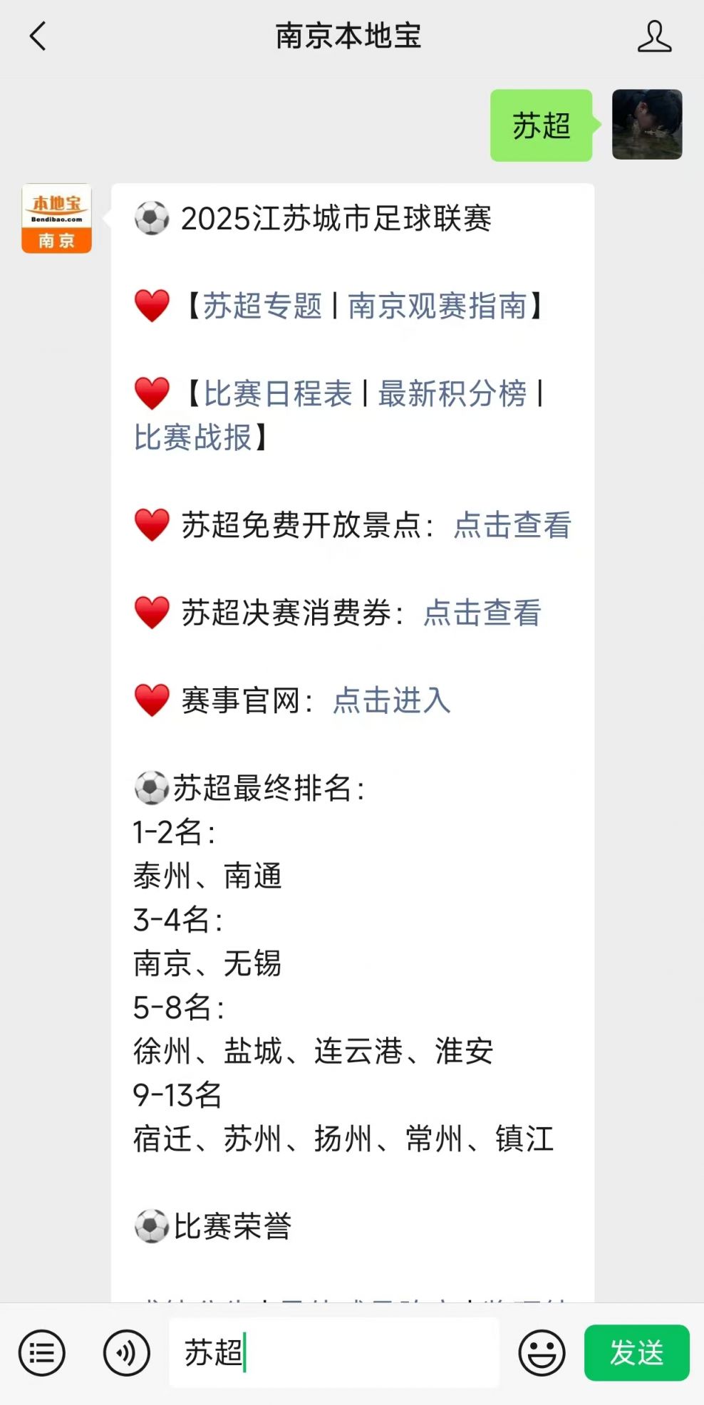 温馨提示:微信搜索【南京本地宝】公众号,关注后在对话框回复【足球】获取2025江苏城市足球联赛赛事指南,查看最终比赛结果/排名情况、比赛奖励、赛事荣誉奖项、比赛直播/回放入口、苏超消费券领取入口、苏超城市免费开放景点,以及2026苏超最新消息等。